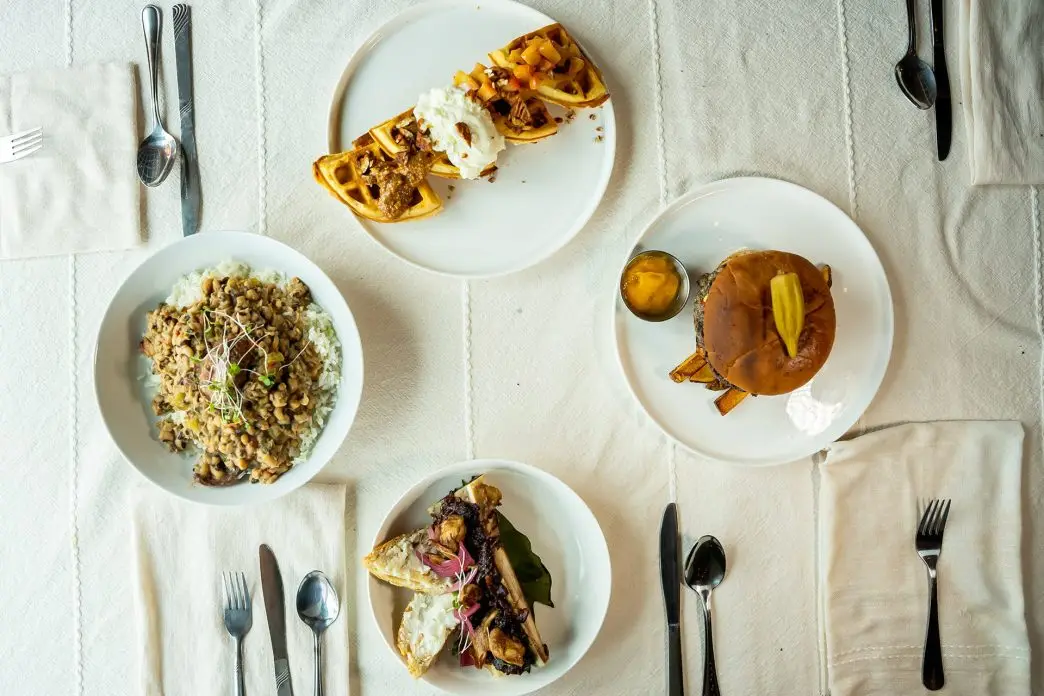 Bay Green’s microgreens add a pop of color to decadent, melt-in-your-mouth bone marrow and lion’s mane mushrooms from Mario’s Mushroom Farm with bacon jam. House-made butternut squash ketchup is paired with fries and a thick burger piled high with pickled red onions, grilled peppers, and rich Knolle Dairy Farm’s panela. Pickled okra, sitting on top of a bun from USS Chefs, gives the plate a burst of acidity. Szczepanek’s take on the seasonal, comforting and hearty Hoppin’ John is peppered with a bite of spice from Boarri Craft smoked sausage. Spicy pecans pop with flavor, adding another layer of flavor to Belgian waffles paired with sweet apple compote and luscious dulce de leche. The burger and waffles are mainstays of Farmacy’s menu, Szczepanek says. But even those reflect what is available locally. “You can’t really change brunch that much. I did try a rhubarb compote, and I was so excited to find a Texas rhubarb,” she said. “But for the most part, the menu components stay the same for brunch. You have your mainstays. However, what’s available really drives the dinner menu. It changes almost daily.”